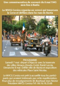Une commémoration du souvenir du 8 mai 1945 aura lieu à Bastia. Le MVCG Corsica organise un convoi qui traversera la Corse et défilera dans les rues de Bastia. PROGRAMME: Samedi 7 mai : départ d'Ajaccio avec la traversée des villes, Venaco, Vivario, Corté, Ponté Leccia. Dimanche 8 mai : Défilé ville de Bastia et exposition des véhicules Place Saint Nicolas. Le MVCG Corsica est prêt à accueillir tous les participants qui seraient intéressés par cette manifestation. Pour plus de renseignements Mr…